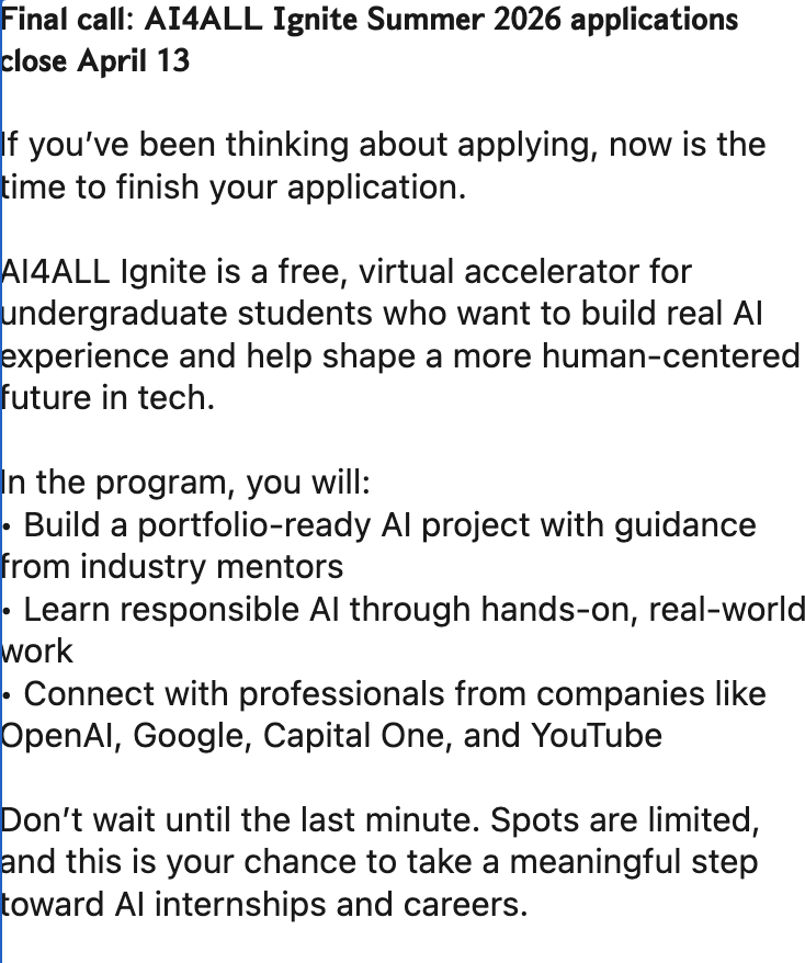 Individuals ‘enrolled in a Bachelor’s or Associate’s program in the U.S., pursuing a major/minor related to Computer Science or Data Science, and having basic programming skills in Python (e.g. CS1) or other coding language’ may consider applying for the AI4ALL Ignite Summer 2026 programme!
