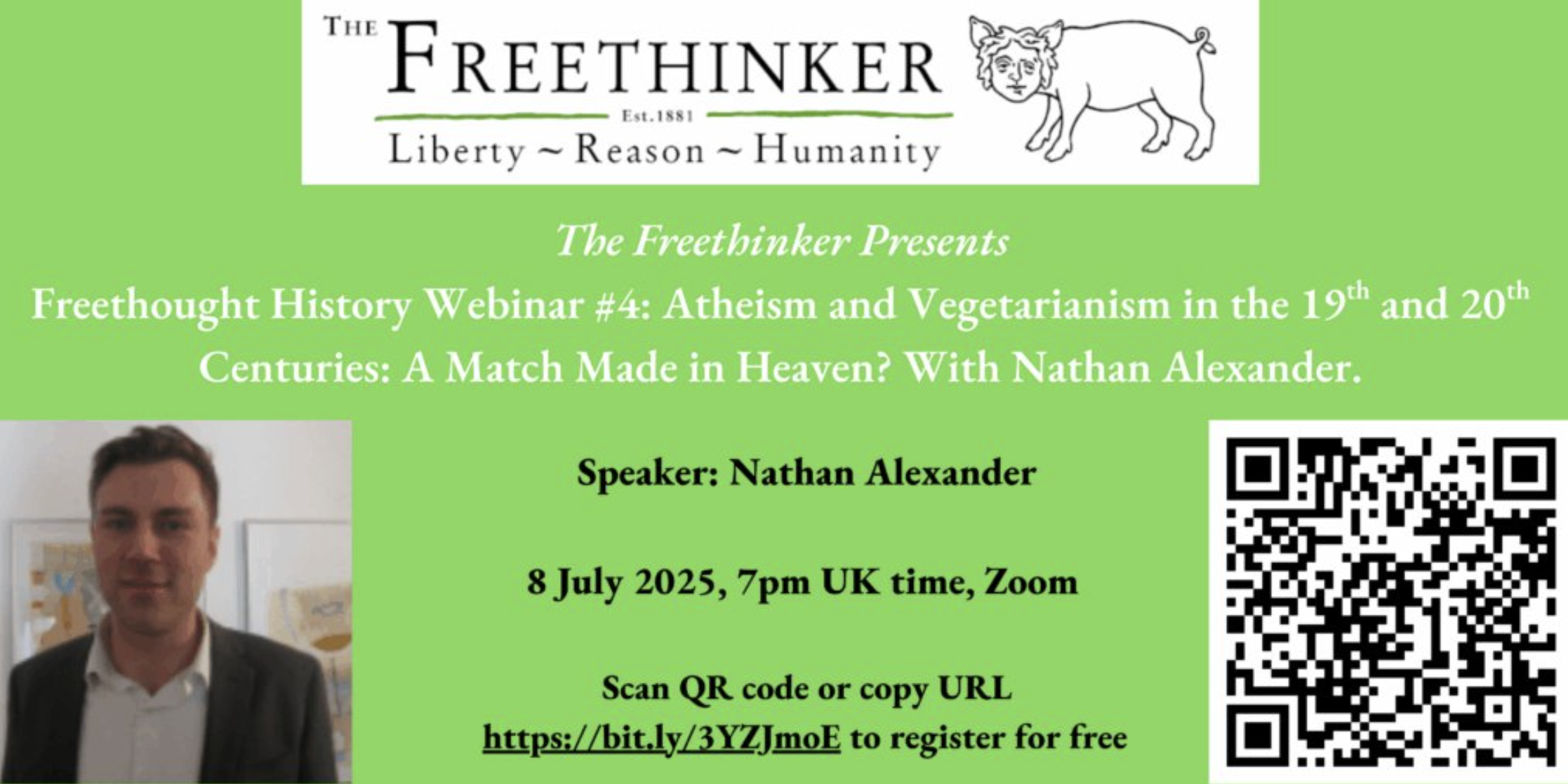 In a webinar to be held on July 08, 2025, Dr. Nathan G. Alexander—the author of Race in a Godless World: Atheism, Race, and Civilization, 1850-1914 (NYU Press, 2019)—will give a Zoom presentation titled ‘Atheism and Vegetarianism in the 19th and 20th Centuries: A Match Made in Heaven?’. The talk will focus on the British historical context, especially in ‘reference to figures like Percy Bysshe Shelley, G.W. Foote, and Henry S. Salt’, according to its abstract posted on The Freethinker.