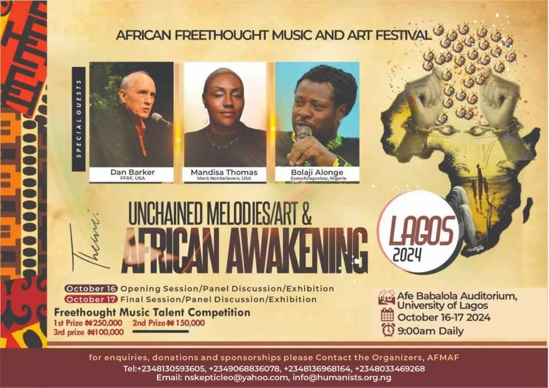 Through October 16-17, 2024, a Freethought Music Talent Competition will be held in Lagos, Nigeria, at the Afe Babalola Auditorium of the University of Lagos.