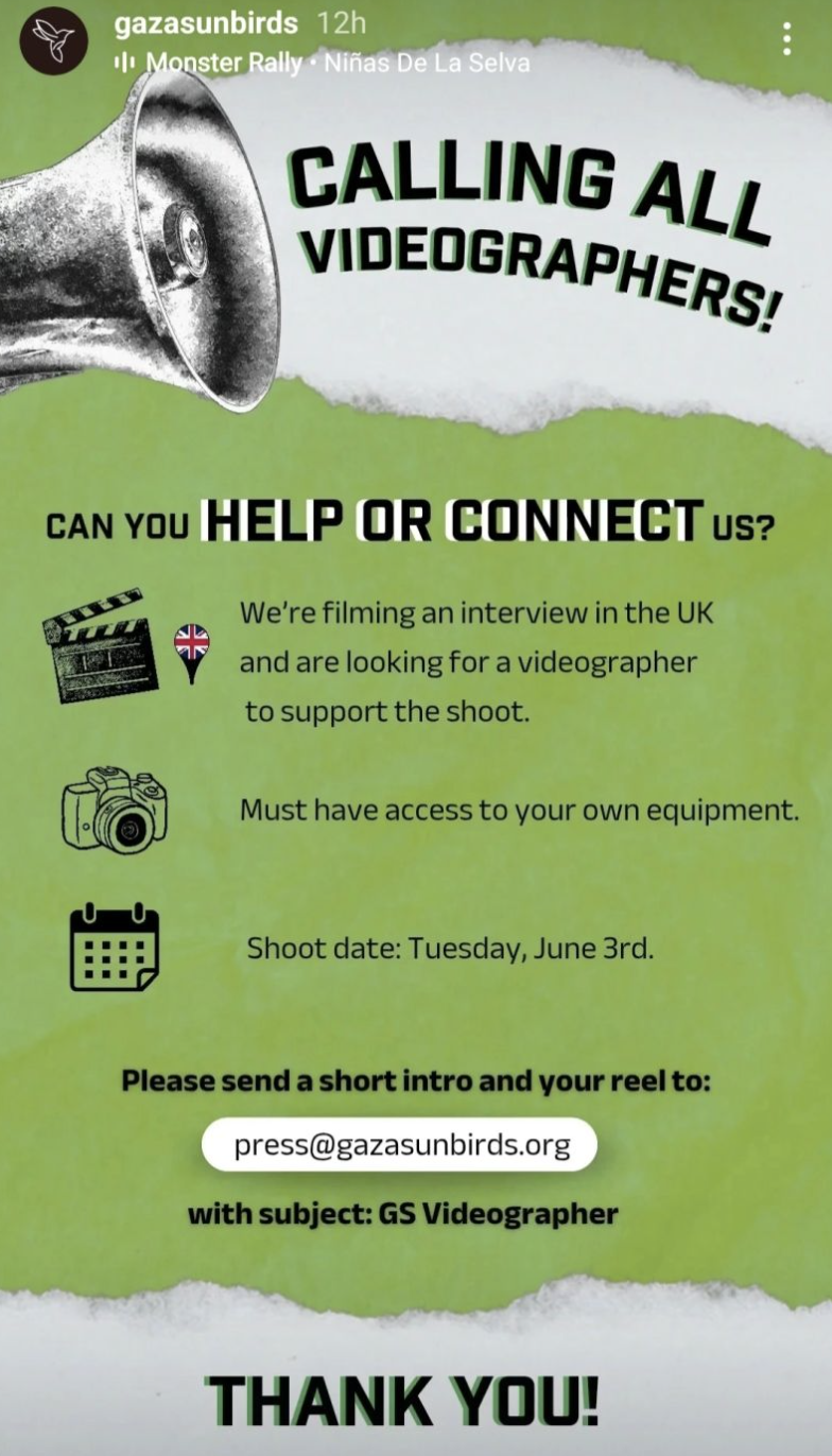 Gaza Sunbirds, a London-based volunteer organisation formed by a group of athletes, is seeking a videographer for an interview to be held in the UK on June 3, 2025. It is not made clear in the call whether this help is sought pro-bono or for pay.