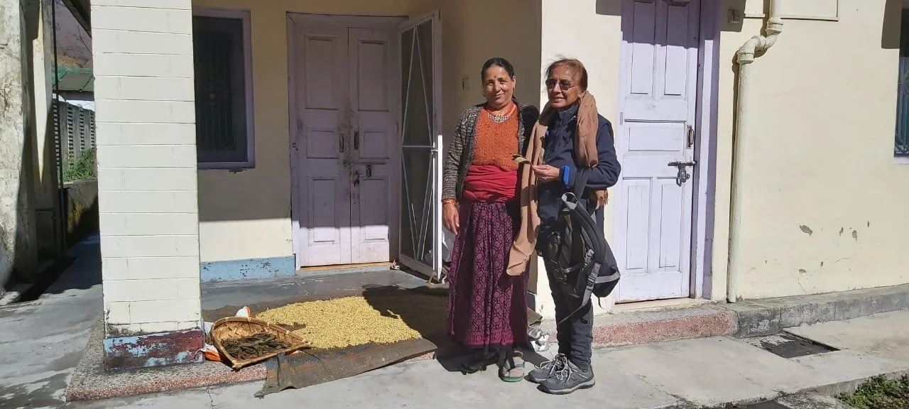 In Bhatwadi village of Tehri Garhwal, Uttarakhand, a local woman dries bhatt daal and kedar patti out in the sun; the woman is pictured standing next to Veena Sharma in this November 2020 photo. (Photo credit: Srimurti)