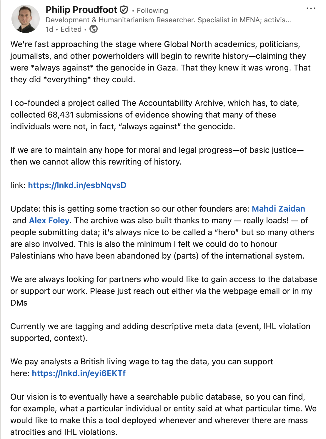 This is a partial screenshot of Philip Proudfoot’s LinkedIn post dated May 22, 2025, relating to the current state of activities at the Accountability Archive, an online project he has co-founded with Mahdi Zaidan and Alex Foley.