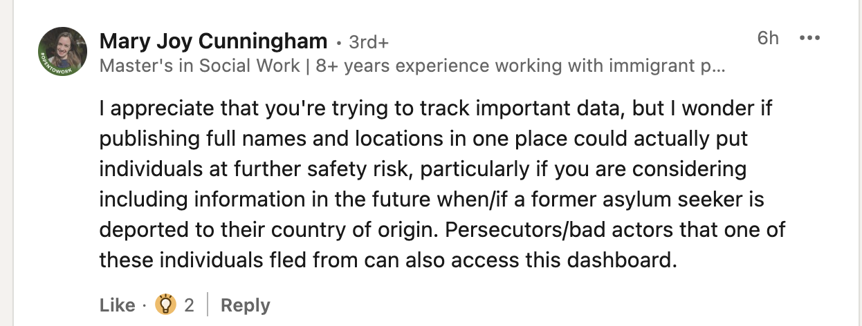 Perhaps on a more urgent note, Mary Joy Cunningham—whose LinkedIn profile describes her as a social worker with experience working with immigrants in the US—alerted Harlow to the possibility that her tracker could be used by government authorities or ‘bad actors’ to endanger former asylum seekers to the US.