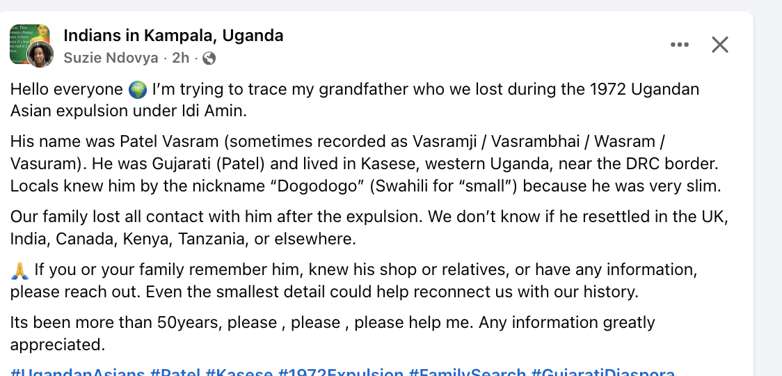 An American woman, Suzie (or Susanne) Ndovya, posted a message on a Facebook group earlier today, August 26, 2025, seeking people’s help in locating her grandfather who got ‘lost during the 1972 Ugandan expulsion under Idi Amin.’