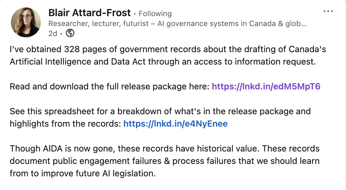 This is a screenshot of Blair Attard-Frost’s LinkedIn post regarding her recent acquisition of governmental records relating to the drafting of AIDA.