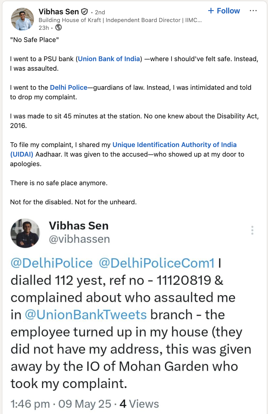 A Delhi resident, Vibhas Sen, came forward on LinkedIn on May 9, 2025, with allegations of physical assault at a Union Bank of India (UBI) branch and mishandling of his subsequent police complaint, sparking online outrage and questions about systemic accountability in India’s public institutions.