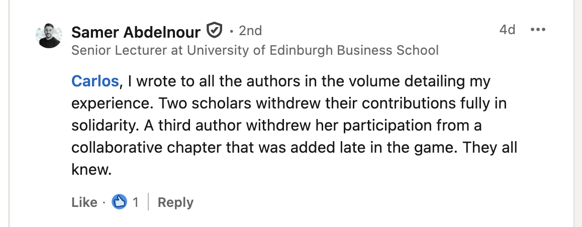 To that comment, Abdelnour responded, ‘I wrote to all the authors in the volume detailing my experience. Two scholars withdrew their contributions fully in solidarity. A third author withdrew her participation from a collaborative chapter that was added late in the game. They all knew.’