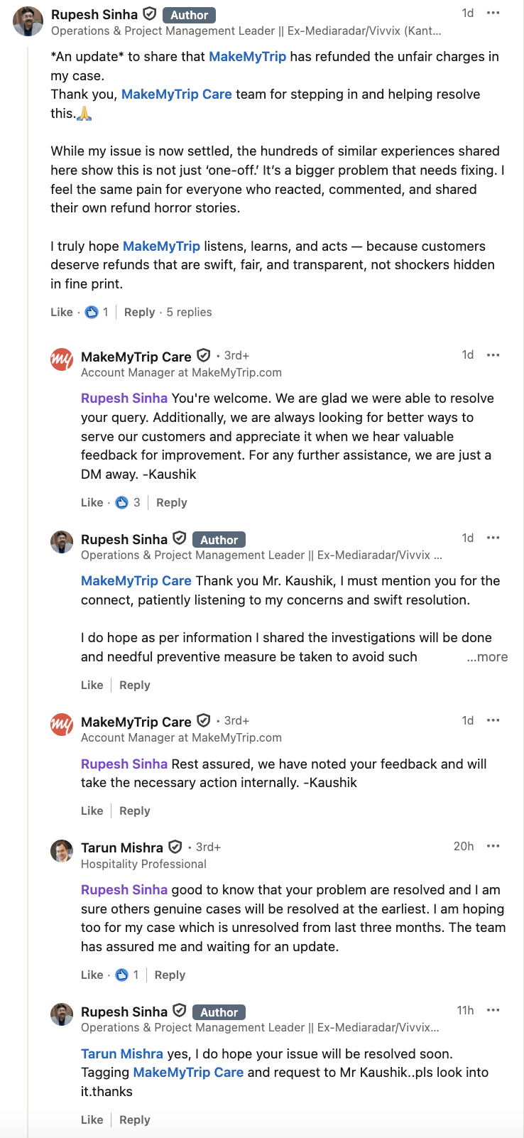 Going by an update he made on September 26, 2025 to his LinkedIn post, corporate executive Rupesh Sinha sounded like a satisfied customer of MakeMyTrip, the India-based online travel company. The update was about a refund he had received for the charges he had recently incurred on that company’s website.